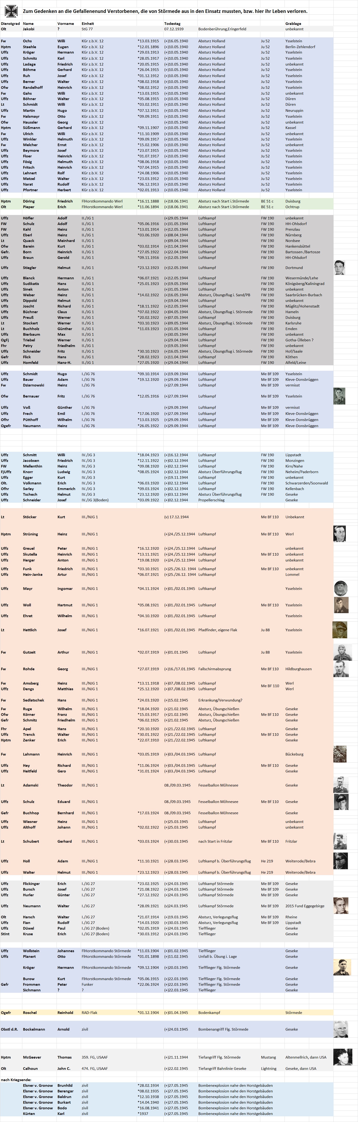Überblick über die Gefallenen und Verstorbenen, die im Kontext mit den historischen Ereignissen um den Fliegerhorst Störmede standen