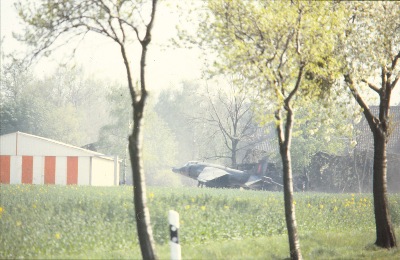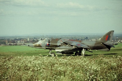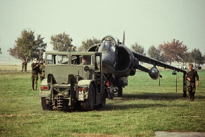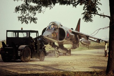 Hier wird ein "Harrier" zu seinem Abstellplatz geschleppt über die alte Ost-West-Straße des ehemaligen Fliegerhorstes. 1983 stürzte eine Maschine kurz nach dem Start in richtung Mittelhausen wegen Triebwerksausfall ab. Der Pilot konnte sich zu seinem Glück mit Schleudersitz und Fallschirm retten. Es handelte sich dabei um Fl. Leutnant Brown, IV. Sqdr. copyright: Photo Pete Mears (all rights reserved)