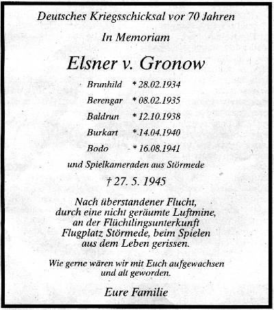 08.Juli 2015: Im der Lokalzeit Südwestfalen wurde ein Bericht gesendet mit dem Thema: ,,Weltkriegsmunition im Boden". Passend dazu ein Interview mit einem Mitarbeiter des Kampfmittelräumdienstes des Reg.Bez. Arnsberg. Unpassend zum Titel der Kurzbericht und ein Interview mit Berthold Elsner v. Gronow,der in unten stehender Anzeige seiner auf dem Gelände des Fliegerhorsts verstorbenen Geschwister gedachte. Leider auch hier kein Hinweis auf das 6. Opfer aus der Familie Kürten! Zu sehen war die Haupttafel (3) des Rundwegs ,,Fliegerhorst Störmede".,,Nur eine Tafel erinnert..." , hieß es im Bericht. Allerdings ohne Tafel und ohne Buch wäre wäre alles vergessen. Das sollte man doch fairerweise beachten! Der Link zum Beitrag: http://www1.wdr.de/mediathek/video/sendungen/lokalzeit/lokalzeit-suedwestfalen/videoweltkriegsmunitionimboden100_size-L.html?autostart=true#banner