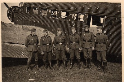 Eine Besatzung der Kgr.z.b.V.12 vor ihrer Ju 52; der Abflug an die holländische Grenze steht bevor - allerdings hat Holland bereits kapituliert. Das mag die entspannten Gesichter erklären.