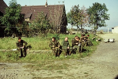 Soldaten der britischen Rheinarmee nutzen das Gelände des ehemaligen Horstes seit den 50er Jahren für Übungen. Hier eine Aufnahme aus dem Jahr 1973. Links im Hintergrund das ehemalige Kommandanturgebäude, bis 1978 bewohnt, anschließend als Odachlosenheim genutzt. Rechts im Hintergrund die Flugzeughalle des Aero-Sportclubs Geseke-Büren. Der Club verlegte später sein Domizil nach Ahden, dem heutigen Regionalflughafen Paderborn/Lippstadt. copyright: Photo Pete Mears (all rights reserved)